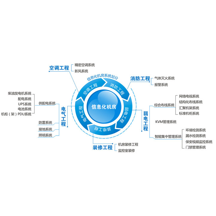 信息化系统建涉及范围包括:综合布线、计算机网络、应用软件开发、互联网接入、电子会议、楼宇自动化、安保监探系统、办公自动化、闭路电视、公共广播、计算机机房工程等领域。