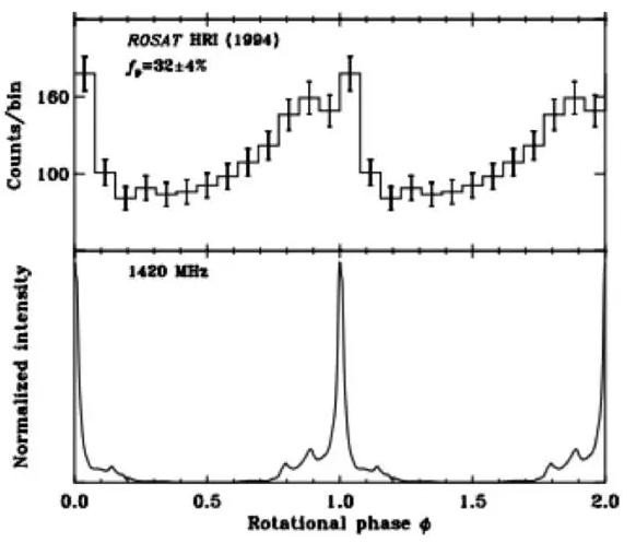 脉冲平均轮廓在X射线波段(上)和射电波段(下)的对比